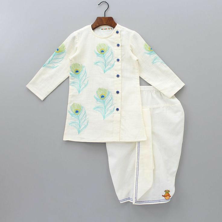 Peacock Motif Kurta: The long-sleeved cream kurta features beautifully detailed peacock feather embroidery on the front and sleeves.